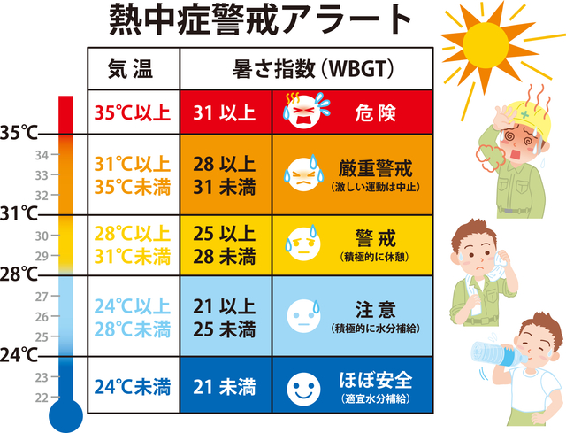 環境省の熱中症予防情報サイトなどで発表されている暑さ指数を確認し、危険なレベルの日は外出を控えたり、いつも以上に熱中症対策をしたりする参考にしましょう。
